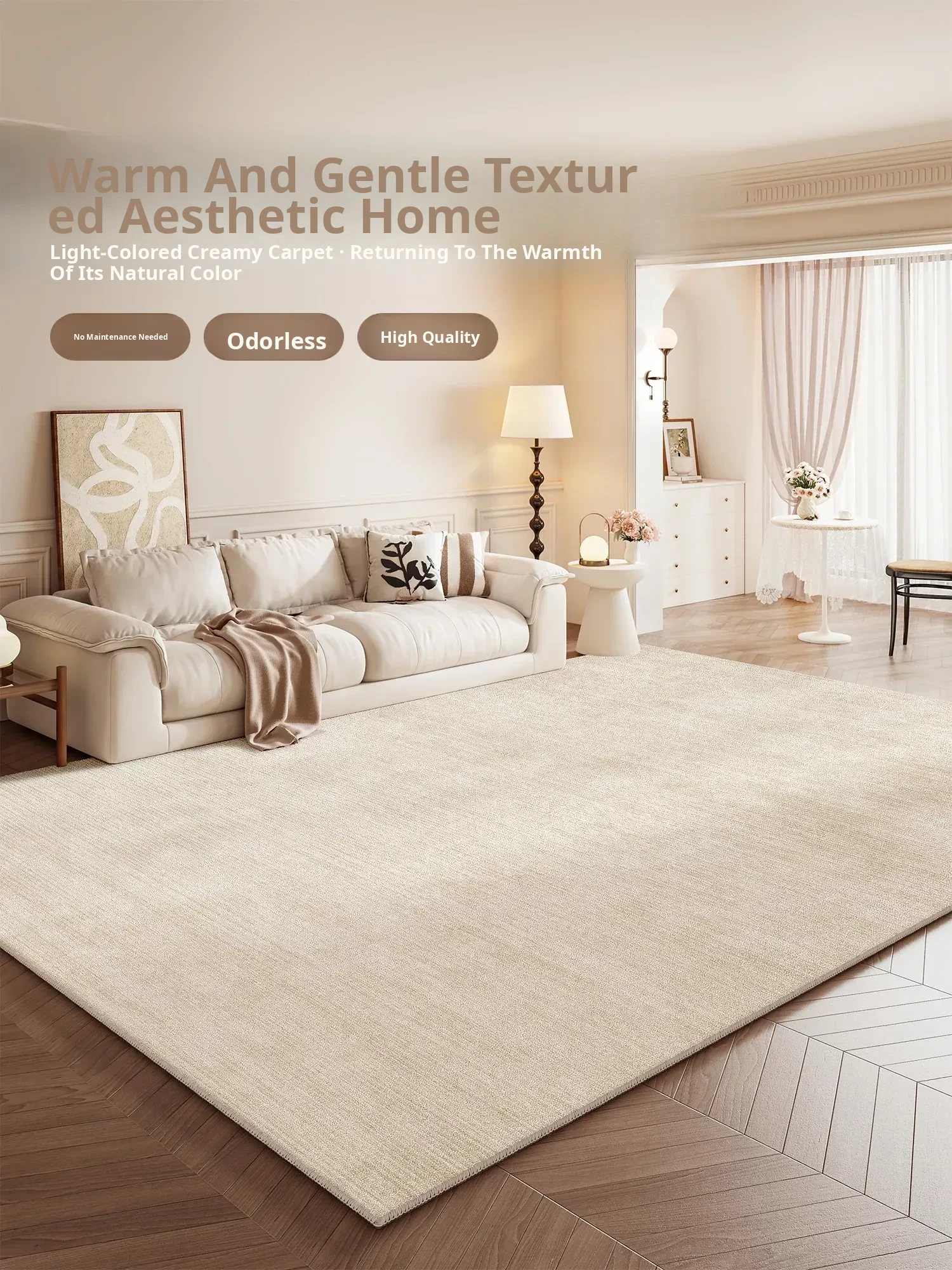 Cream-Colored Non-Washable Carpet for Living Room - Easy-Clean Waterproof Bedroom Rug, Cozy Bedside Mat, No Maintenance Required for Home Use